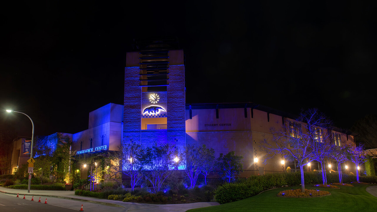 The Student Center washes its building in blue light to show support for healthcare and essential workers.